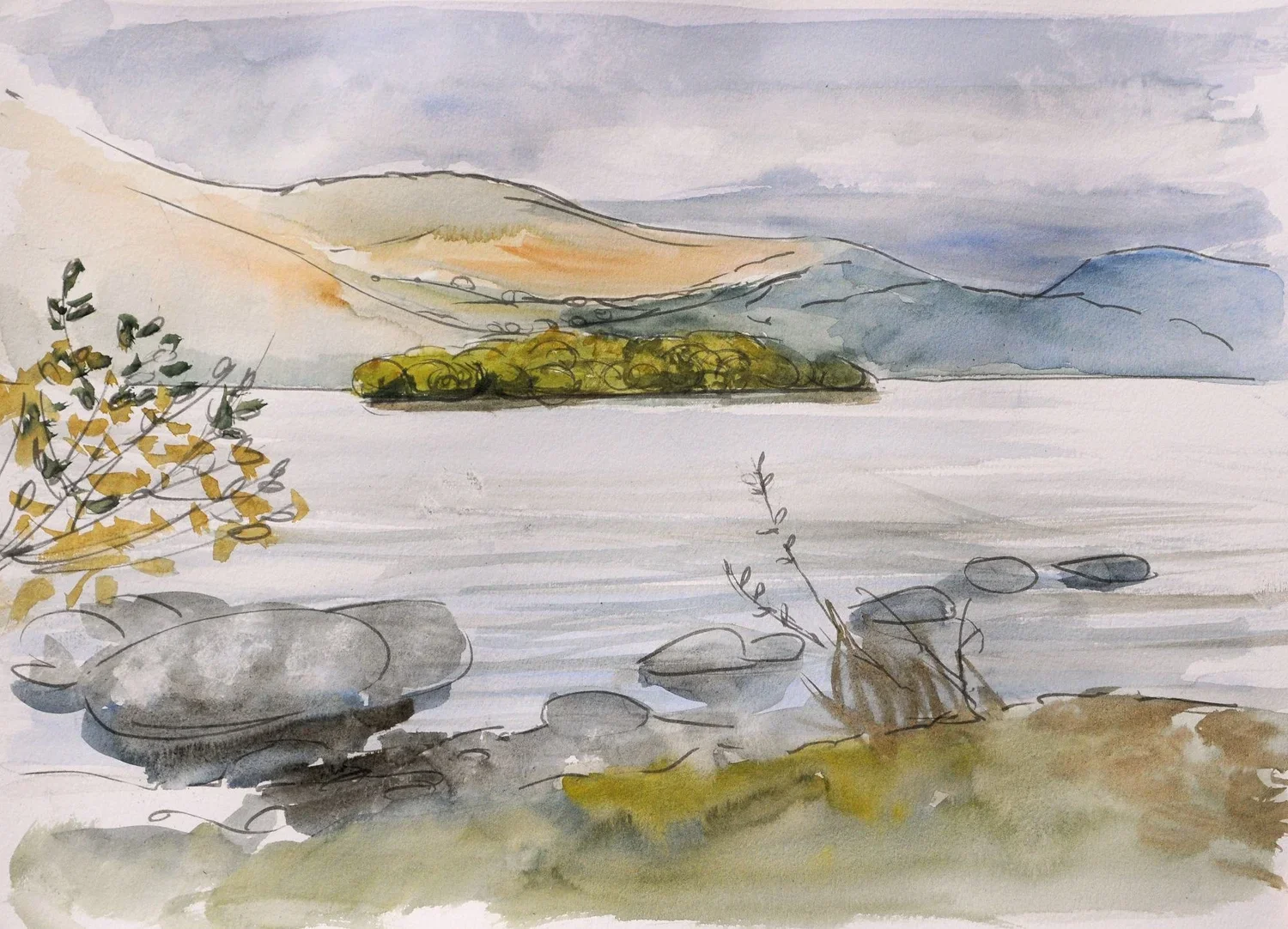 To demonstrate pen and ink technique, Alison recreated one of Beatrix Potter’s most famous paintings from The Tale of Squirrel Nutkin for Mariella. This painting depicts squirrels crossing the lake to Owl Island on rafts - in reality the island is St Herbert’s Island on Derwentwater, and the scene is viewed from the lakeside at the Lingholm Estate near Keswick.