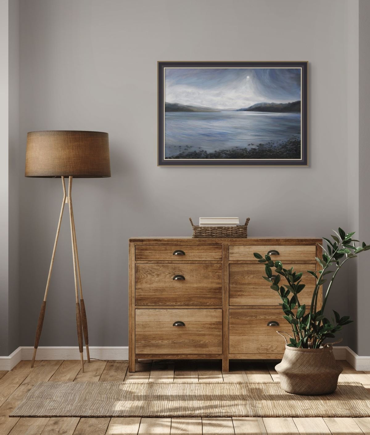Back in the studio, I built the painting up in layers of thinned paint, to recreate the feeling of mist and atmosphere. Sometimes visitors to the gallery think they are looking at a moonlit night sky, until I explain how strange the weather was that day.