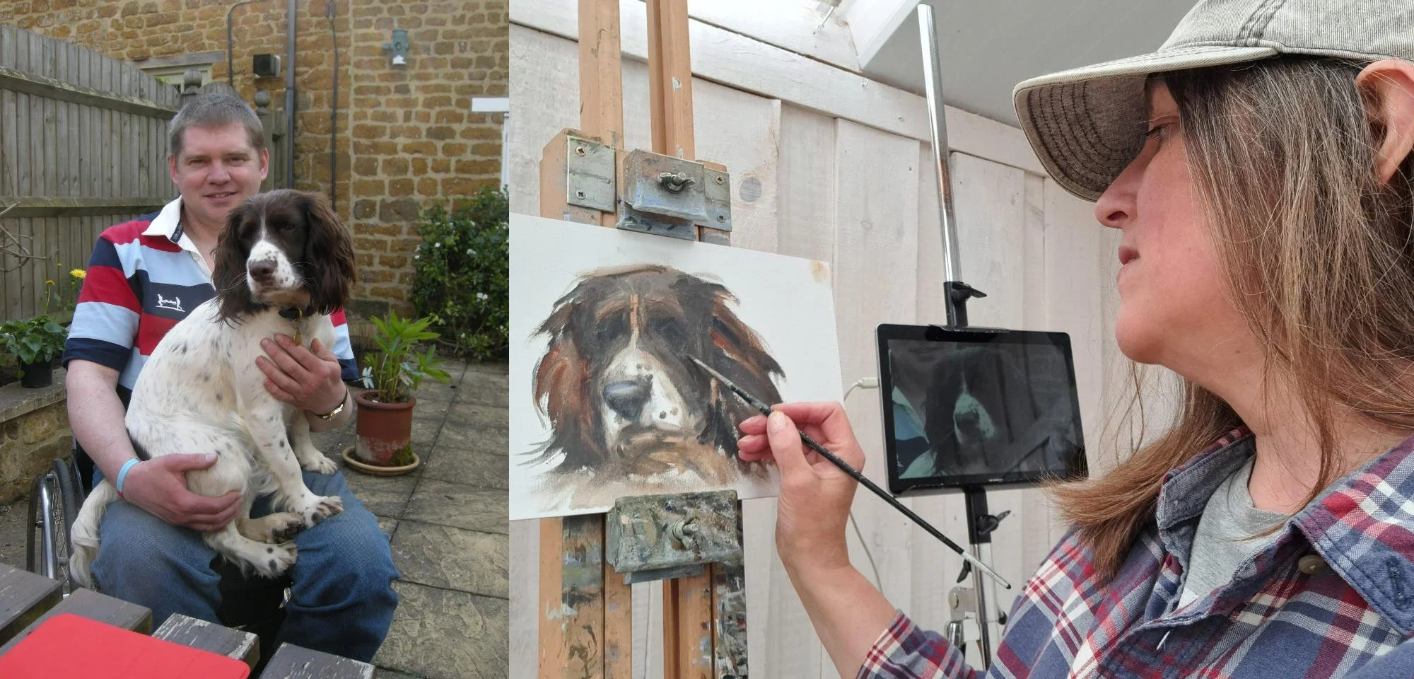 Alison painting English Springer Spaniel, alongside the original photograph of Dilys sitting on Jon’s knee